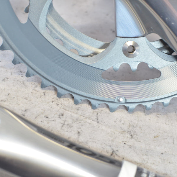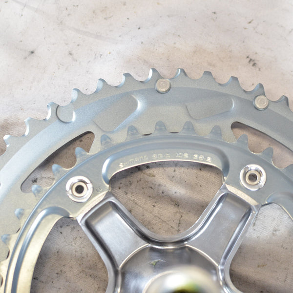 Double 10 speed crankset in 170 mm. Rare new old stock. NOTE: Does not include crankarm fixing bolt. These are commonly available from aftermarket producer's under "M18 crankarm fixing bolt" - be sure to get M18 for this crank, as opposed to the more common M20 size most Shimano cranks use.