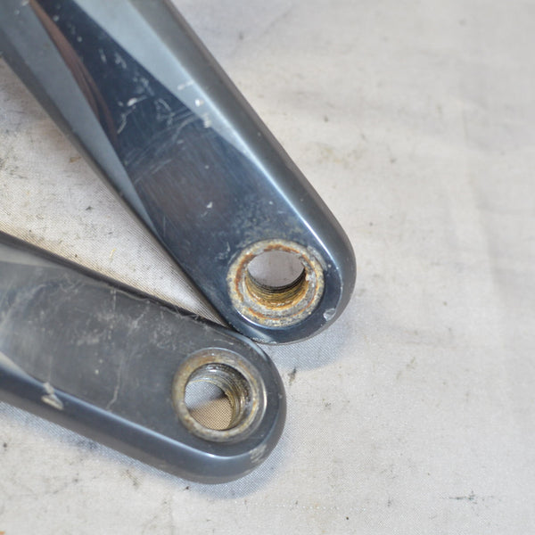 Heavy signs of use as seen. Pedal threads have some corrosion, but pedals do successfully thread in. Crankface and arm have significant rub. Wear is not bad on the small ring, moreso on the large, though it still has life yet to go!
